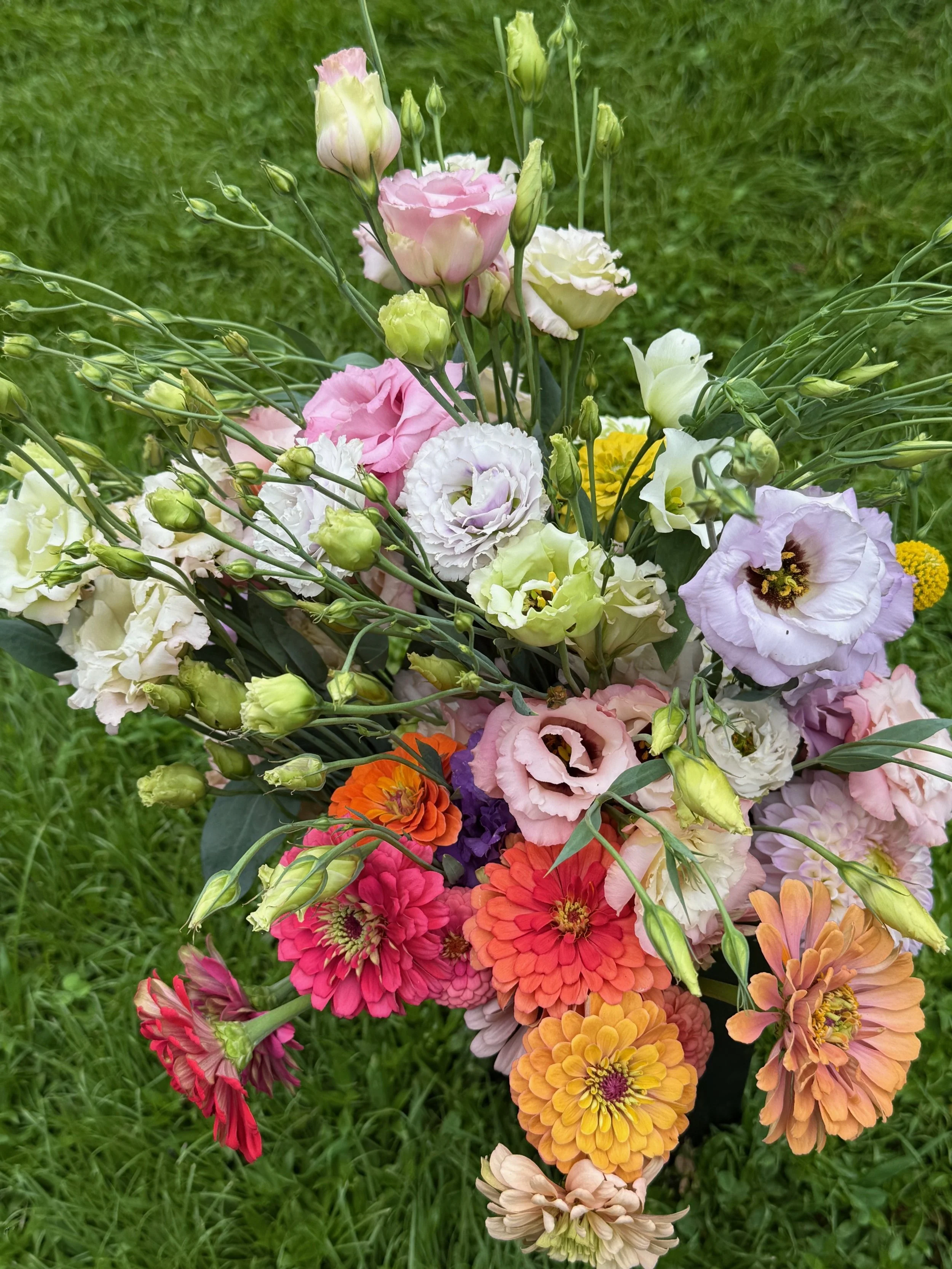 βThe plants are very well cultivated and taken care of and chosen for their variety and sturdy blooms. Here you see some of the arrangements I made with their flowers, which also included some flowers for my own garden. It was a very nice pairing!β